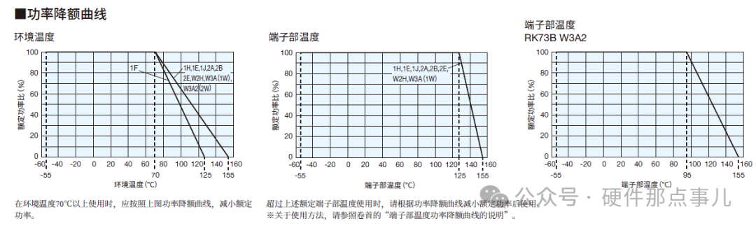 对于贴片电阻器而言,一般70℃是其额定功率降低的关键温度点,特别当我们设计的产品中的电阻器使用温度超过70℃时,一定要注意。需要注意的是,不同的厂家的降额曲线参考的温度点是不同的,以KOA的贴片电阻为例,其规格书中给出了两种降额曲线,一种是参考环境温度,一种是参考端子部温度,一般根据自己的使用状况而定,如果不清楚是该使用额定环境温度还是额定端子部温度,以额定端子部温度为优先。
