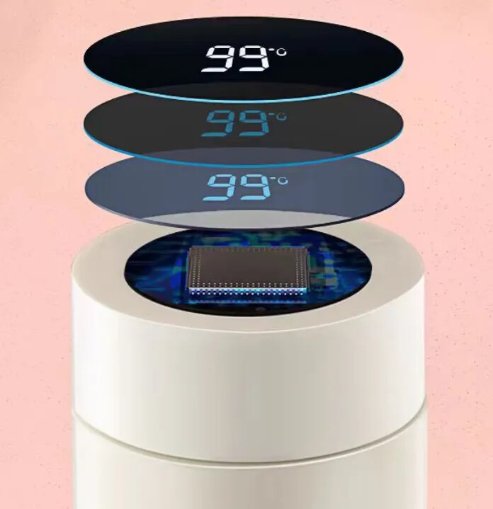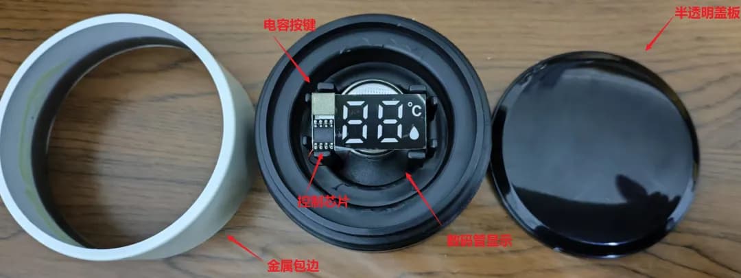 最近碰巧家里的保温杯开胶了,于是就顺道把它拆了,每次拆这种小玩意就像开盲盒一样,总是有惊喜。今天的拆解对象如下所示,即一个带温度显示的保温杯盖子: