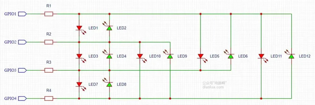 那么4个管脚可以控制17个灯吗?答案是肯定是不可以的,按照查理复用法,最多4个管脚只能控制12颗灯(2*6)。