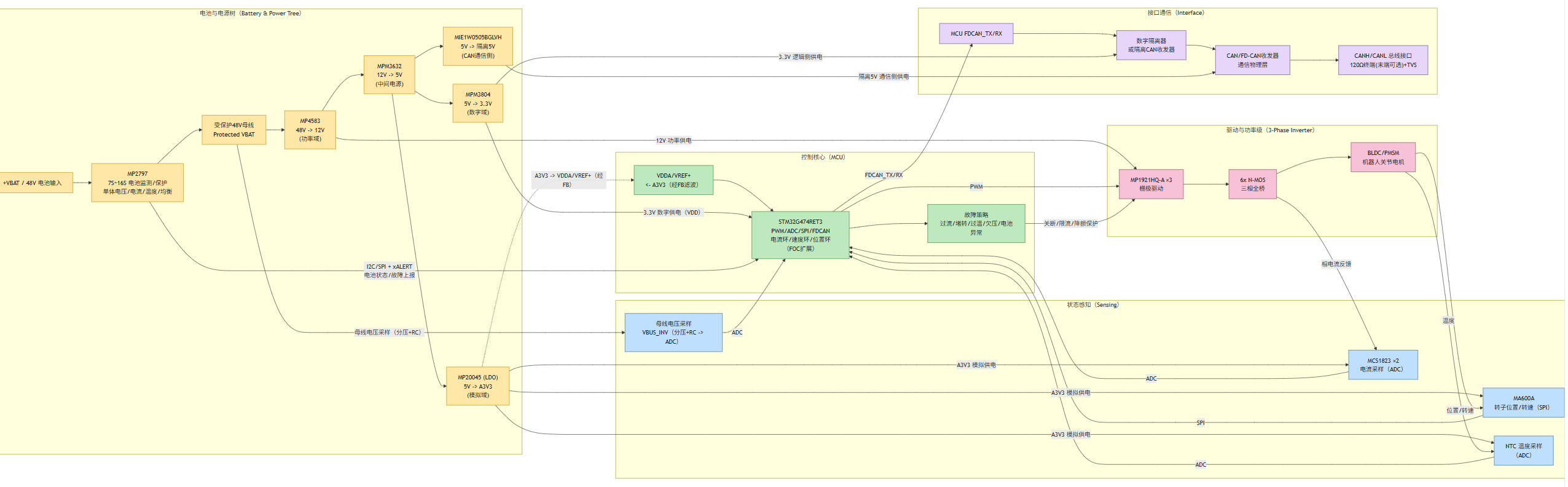 主控采用STM32G474RET3,负责PWM输出、ADC采样、SPI位置读取、故障处理和CAN/FD-CAN通信。通信链路用于接收机器人主控的运动指令,并上传关节位置、电流、温度、母线电压和故障状态。